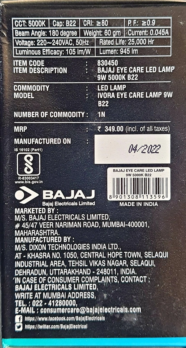 BAJAJ EYE CARE LED LAMP 9W 5000k B22D