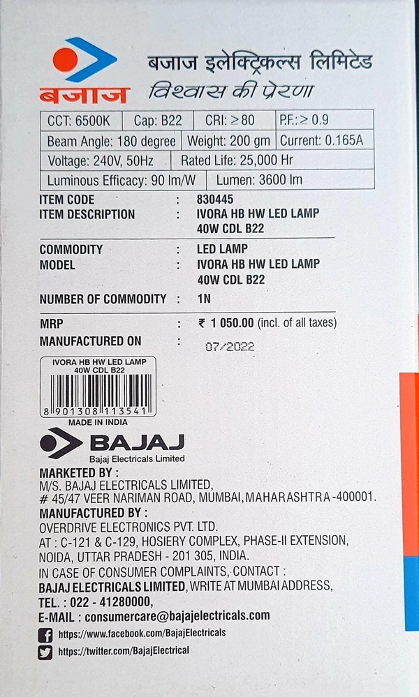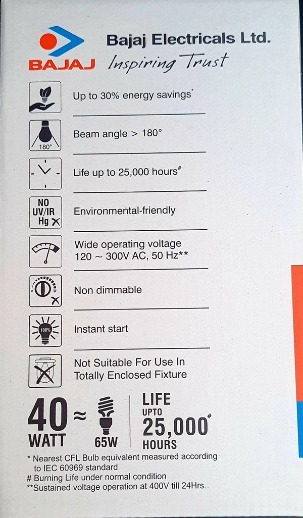BAJAJ IVERA HB HW LED BULB 40W CDL B22D