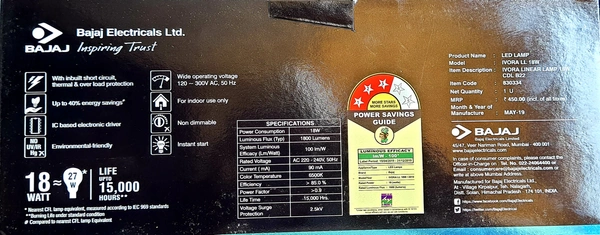 BAJAJ IVORA LED LINER LAMP 18W CDL B22D