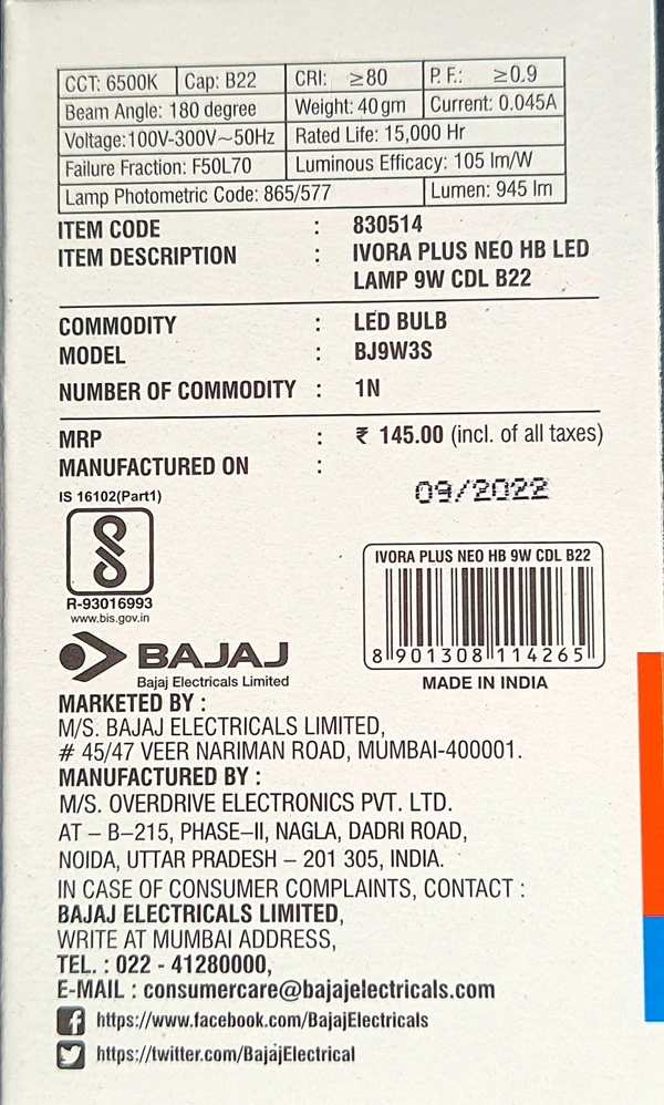 BAJAJ IVORA PLUS NEO HB 9W CDL B22D