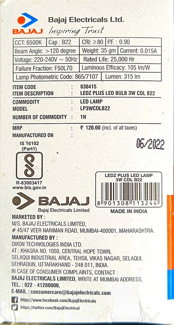 BAJAJ LEDZ PLUS 3W CDL B22D